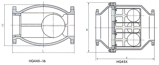 HQ44X-10 16外尺寸(單球式) 公稱通徑 200 250 300 350 400 450 600 700 800 900 1000 L(mm) 550 650 750 850 950 1050 1350 1450 1650 1900 2100 H(mm) 510 570 640 715 815 825 1155 1260 1350 1660 1700 連接尺寸 法蘭連接尺寸PN1.0MPa按GB4216.4-84;PNl.6MPa按GB4216.5-84標(biāo)準(zhǔn)